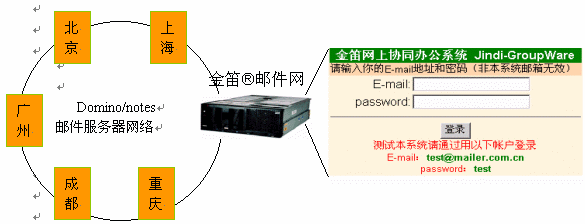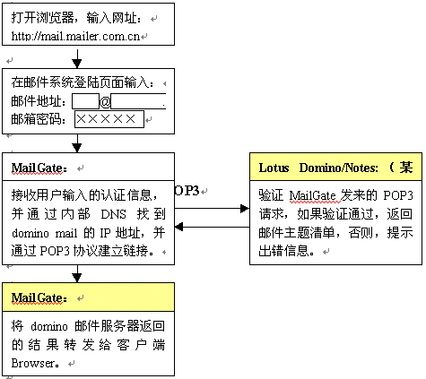 (1) 在不改變現(xiàn)有網(wǎng)絡(luò)硬件、軟件環(huán)境的情況下,添加一臺(tái)郵件網(wǎng)關(guān)服務(wù)器,通過(guò)統(tǒng)一的web登陸界面,輸入Email地址和密碼后,金笛?郵件網(wǎng)關(guān)會(huì)自動(dòng)根據(jù)內(nèi)部DNS找到該用戶(hù)所在的Domino Mail Server, 并通過(guò)標(biāo)準(zhǔn)郵件協(xié)議POP3提取該用戶(hù)的郵件,以web頁(yè)面形式顯示在用戶(hù)屏幕上。