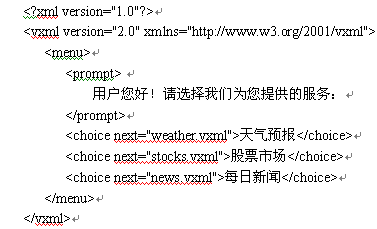 目前人們對HTML已經(jīng)很熟悉,類似于用于Web網(wǎng)頁標記的HTML,VoiceXML是為語音應用制訂的語音可擴展標記語言。VoiceXML使公用電話網(wǎng)與互聯(lián)網(wǎng)的結(jié)合體現(xiàn)在三個方面:語音瀏覽器的使用,互聯(lián)網(wǎng)和公用電話網(wǎng)的信息共享,以及類似于Web網(wǎng)頁開發(fā)過程的語音應用系統(tǒng)的開發(fā)。