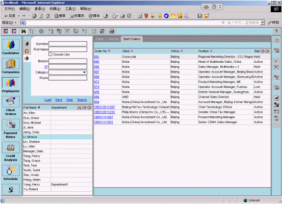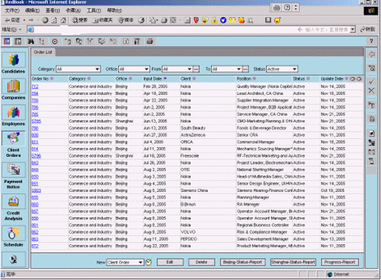 融博獵頭業(yè)務(wù)管理系統(tǒng)已經(jīng)被某著名的獵頭公司正式上線,該系統(tǒng)同時在北京、上海等五個分公司使用。根椐使用客戶反映,該系統(tǒng)功能強(qiáng)大、操作簡單,基本覆蓋了獵頭業(yè)務(wù)的全部內(nèi)容;各種業(yè)務(wù)流程規(guī)范、流暢;各類統(tǒng)計報表靈活、準(zhǔn)確;自動生成簡歷、客戶提交報告、催款通知、項目進(jìn)度報告,極大地提高了企業(yè)的工作效率。該系統(tǒng)與目前國際先進(jìn)的獵頭公司所使用的系統(tǒng)相比,處于領(lǐng)先的地位。