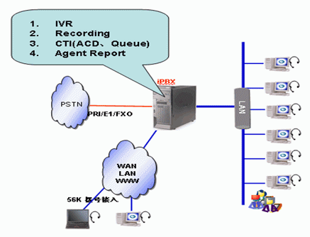 Asterisk IP PBX與相關板卡結合就能夠實現(xiàn)IP PBX與呼叫中心完美結合的一體化解決方案。該方案結合了IP網(wǎng)的靈活性及硬件平臺自身強大的通信能力、板載資源、媒體處理能力和多種接口等而產(chǎn)生的一種高效、便捷、低成本的應用方案。與傳統(tǒng)PBX及IP