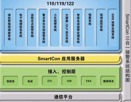 110/119/122等系統(tǒng)和一般企業(yè)的客服系統(tǒng)和熱線系統(tǒng)有一定的共性,但它們肩負(fù)著保障社會(huì)安定和人民生命財(cái)產(chǎn)安全的重任,這些決定了該系統(tǒng)的特殊性,使它有別于其他行業(yè)的應(yīng)用。我們公司依托雄厚的技術(shù)開發(fā)力量,結(jié)合多年來在公安/消防/交通領(lǐng)域豐富的系統(tǒng)研發(fā)實(shí)施經(jīng)驗(yàn)積累,面向未來的發(fā)展,提出了以SmartCon呼叫中心平臺(tái)為核心的三體合一的、綜合的整體解決方案。該解決方案充分考慮到公安/消防/交通系統(tǒng)的現(xiàn)在和未來的發(fā)展趨勢,110/119/122三個(gè)系統(tǒng)既可分開單獨(dú)處理報(bào)警事務(wù),也可整體考慮、整體調(diào)度。該解決方案涵蓋了電話報(bào)警、SMS報(bào)警、接處警指揮調(diào)度、電子地理信息系統(tǒng)(GIS)、現(xiàn)場監(jiān)視以及小區(qū)報(bào)警雄等等,各個(gè)子系統(tǒng)之間相對獨(dú)立,用戶可以根據(jù)實(shí)際要求,進(jìn)行自由搭配,充分體現(xiàn)了系統(tǒng)的靈活性。
