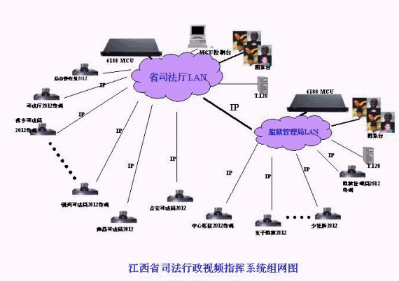江西司法視頻會議系統(tǒng)的拓撲結(jié)構如圖所示。整個視頻會議系統(tǒng)為星型拓撲結(jié)構,其中二級網(wǎng)以省司法廳和省監(jiān)獄管理局為主會場,放置2個MCU;另外,包括11個地市司法局的分會場(南昌、九江、贛州、吉安、撫州、鷹潭、萍鄉(xiāng)、新余、上饒、景德鎮(zhèn)、宜春),14個監(jiān)獄和農(nóng)場分會場,傳輸網(wǎng)絡為2M IP網(wǎng)絡,視頻會議協(xié)議為H.323;司法局和監(jiān)獄管理局也可以單獨成網(wǎng),在分別依托省司法廳和省監(jiān)獄管理局MCU的情況下,各地市司法局或監(jiān)獄系統(tǒng)可與省司法廳或省監(jiān)獄管理局單獨進行雙向的視頻會議,整個系統(tǒng)具有很強的靈活性和擴展性。
