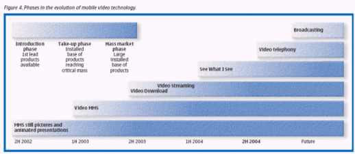 諾基亞計劃在2003年的第一季度,向市場投放一千萬到一千五百萬部帶視頻功能的智能手機(jī),并準(zhǔn)備公布22種不同功能的MMS方式。諾基亞也希望在2003年能售出大約一千萬部60系列的手機(jī)。諾基亞為所有終端平臺提供了3GPP公開標(biāo)準(zhǔn),并在60系列的終端平臺上補充了Real-One