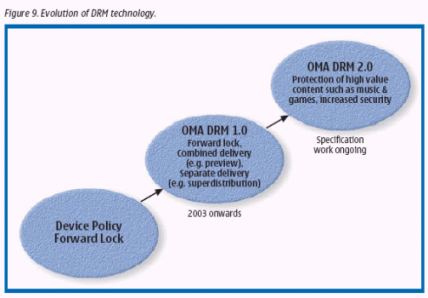 圖9簡要概述了DRM技術(shù)的發(fā)展經(jīng)過。迄今為止,市場已經(jīng)為保護(hù)內(nèi)容提供了各種各樣的版權(quán)解決方案。其中一種值得提及的解決方案是"device policy