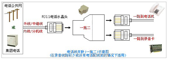 2. 電話線并聯(lián)方式:(采用一拖二將電話線路一分為二,一路到電話機(jī),一路到錄音卡)