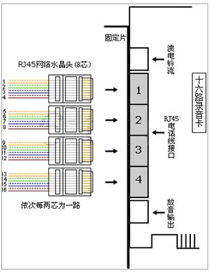 4.16路錄音卡接線方式:(每個(gè)RJ45水晶頭,依次每兩芯為一路)