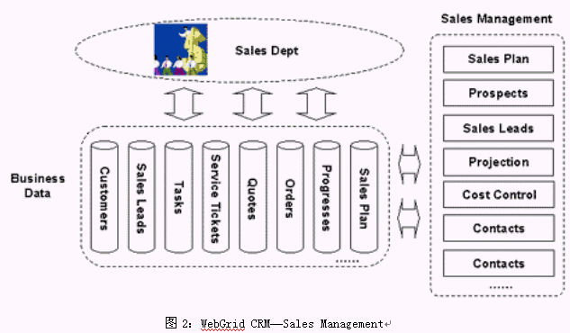 WebGrid CRM是基于CRM理念而設計的,它將面向客戶的所有業(yè)務進行整合,提供了統(tǒng)一的業(yè)務平臺,并使用工作流技術將各種業(yè)務緊密聯(lián)系起來。WebGrid CRM 的功能可以歸納為三個方面:1) 對銷售、營銷和客戶服務三部分業(yè)務流程的信息化;2) 與客戶進行溝通所需要的手段(如電話、傳真、網(wǎng)絡、Email等)的集成和自動化處理;3) 對上面兩部分功能所積累下的信息進行的加工處理,產(chǎn)生客戶智能,為企業(yè)的戰(zhàn)略戰(zhàn)術的決策作支持。見下圖所示: