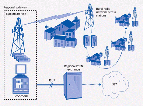 鄉(xiāng)村網絡方面,GroomerII通過EEMA協議與信道組合器相連,這樣即可與DaRT單元及廣播天線連接,進而從本地網絡的存取點傳輸和接收信號。目前,本系統(tǒng)共裝備了16臺GroomerII網關,每一個都與本地交換機相連。這些網關通過信道組合器和提供多達15個DaRT單元的E&M電路連接,支持30線的PSTN訪問。