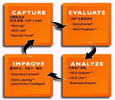 NICE System公司率先提出了CEM-客戶體驗管理-的新觀念,是客戶體驗管理的先驅(qū)者,它將此觀念融入在NICE錄音網(wǎng)控系統(tǒng)中,與ACD、CTI及CRM等客服中心既有的投資設(shè)備整合為一體,便可達(dá)到隨時掌握客戶與客服中心間的互動經(jīng)驗,以期能夠隨時調(diào)整客服中心的經(jīng)營方向與策略,提升客戶的滿意度,并改善坐席人員的服務(wù)效率與品質(zhì)等。 在NICE CEM的概念中,主要是以四個作業(yè)循環(huán)達(dá)成改善的目標(biāo),包括記錄(Capture)、評估(Evaluate)、分析(Analyze)、改善(Improve)等。