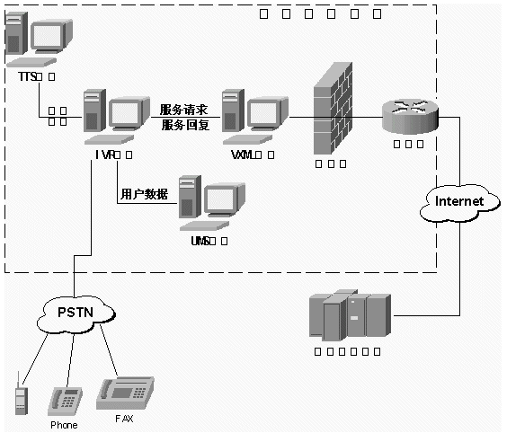 TTS系統(tǒng)、VXML系統(tǒng)、UMS系統(tǒng)與已有IVR(電話語音自動應(yīng)答系統(tǒng))平臺、Internet、PSTN結(jié)合的示示意圖如下: