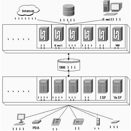 UMS系統(tǒng)將電話網(wǎng)、尋呼網(wǎng)、移動網(wǎng)、互聯(lián)網(wǎng)相互融合,在各個不同網(wǎng)絡(luò)間提供通信和信息交換,向最終用戶提供在任何時間、任何地點,以任何方式(如人工電話、自動語音、自動傳真、尋呼、手機短訊、手機上網(wǎng)、電子郵件、WWW瀏覽等)的個人通信服務(wù)、個人化信息內(nèi)容服務(wù)和個人化電子商務(wù)服務(wù)。