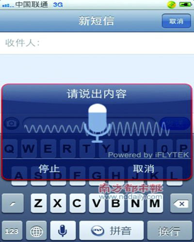 錄入結(jié)束后,點(diǎn)擊“停止”,輸入法會自動開始對剛才錄入的語音進(jìn)行識別。需要注意的是,這個(gè)時(shí)候只有通暢的3G網(wǎng)絡(luò)或者W IFI網(wǎng)絡(luò),才能順利識別;如果信號欄顯示“E”或者“O”,都將無法得到正確識別,也無法錄入短信內(nèi)容。