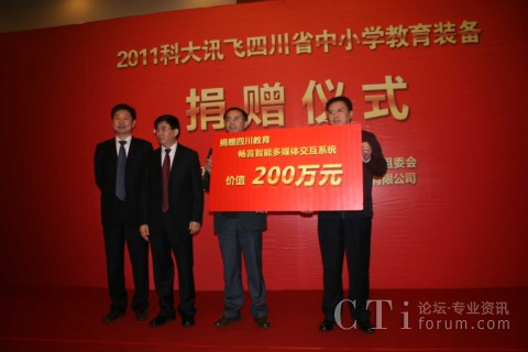 CTI論壇(ctiforum)11月11日消息(記者 潘婷婷): 2011年11月10日,科大訊飛在成都嬌子國(guó)際會(huì)議中心舉行了隆重的捐贈(zèng)儀式,向四川省各市、地州中小學(xué)捐贈(zèng)了價(jià)值200萬(wàn)元的暢言系列教學(xué)產(chǎn)品。會(huì)議由四川省教育廳技術(shù)物資裝備處處長(zhǎng)張生主持,四川省教育廳副廳長(zhǎng)張林祥、科大訊飛副總裁徐玉林在儀式上致辭,來(lái)自各市、地州教育主管部門領(lǐng)導(dǎo)、各縣區(qū)教育局負(fù)責(zé)人、受贈(zèng)學(xué)校教師代表,以及相關(guān)媒體共100多人等參加了捐贈(zèng)儀式。