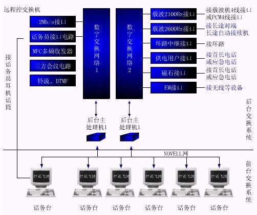 "前臺(tái)座席系統(tǒng)"包括班長臺(tái)和話務(wù)臺(tái),均采用微機(jī),運(yùn)用先進(jìn)的計(jì)算機(jī)聯(lián)網(wǎng)技術(shù),將它們通過網(wǎng)絡(luò)與"后臺(tái)交換系統(tǒng)"相連。班長臺(tái)和所有話務(wù)臺(tái)的硬件連接完全相同,任何一臺(tái)損壞,不影響其它話務(wù)臺(tái)的使用,即不存在關(guān)鍵接點(diǎn),提高了系統(tǒng)的安全可靠性。全漢化圖形界面,交互式人機(jī)操作方式,簡單明了,易于掌握。所有話務(wù)臺(tái)均為集記錄、查號、市話轉(zhuǎn)接、長話轉(zhuǎn)接為一體的綜合型人工話務(wù)臺(tái),所有功能由數(shù)據(jù)定義,可分可合,可方便的進(jìn)行設(shè)置,也可臨時(shí)并席,為系統(tǒng)高質(zhì)量的服務(wù)提供了可靠的基礎(chǔ)。所有話票均在計(jì)算機(jī)上填寫,由網(wǎng)絡(luò)自動(dòng)傳送,不再使用紙?jiān)捚,也不需人工分發(fā)話票,極大的減輕了勞動(dòng)強(qiáng)度,提高了辦事效率。為了減小系統(tǒng)規(guī)模,我們將查詢、計(jì)費(fèi)、統(tǒng)計(jì)、管理、維護(hù)五種功能融合為一體,統(tǒng)一成為多功能的班長臺(tái),其功能亦可分可合,視用戶需求而定。