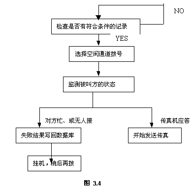 傳真發(fā)送功能是服務(wù)器后臺操作的,系統(tǒng)定時(shí)檢查傳真發(fā)送庫,一旦有符合條件的記錄,自動(dòng)選擇空閑端口,按設(shè)定的傳真號碼撥號,檢查被叫方的狀態(tài),若對方有傳真機(jī)應(yīng)答,則開始發(fā)送傳真;若對方忙、或無人接,系統(tǒng)稍后會(huì)再次試撥。若超過設(shè)定次數(shù)仍未發(fā)送成功,系統(tǒng)會(huì)通知發(fā)送人作其它處理。