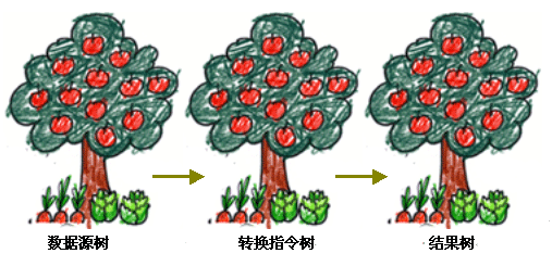 一棵或多棵數(shù)據(jù)源樹(XML數(shù)據(jù)源文件),通過一棵轉(zhuǎn)換指令樹(選擇數(shù)據(jù)、表達數(shù)據(jù)表現(xiàn)形式的模板文件),獲得了一棵結果樹(圖表、報表)。