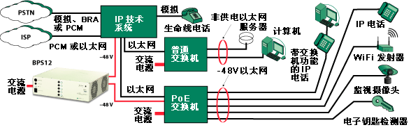 上圖顯示了如何將 BPS12 部署到典型的網(wǎng)絡(luò)中。該公司擁有一個 IP 電話系統(tǒng),并使用 BPS12 來確保當(dāng)交流電源中斷時電話服務(wù)繼續(xù)工作。此方案中沒有使用