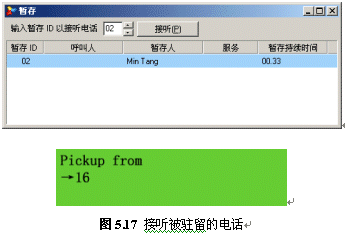 接通后,如果通話(huà)內(nèi)容很緊急而又不方便在會(huì)議室進(jìn)行溝通,此時(shí),用戶(hù)可以按下話(huà)機(jī)上的“Park”按鈕,此時(shí)對(duì)方通話(huà)被導(dǎo)入到一段音樂(lè)(背景音中設(shè)定的音樂(lè))。記住屏幕上提示的駐留號(hào)碼,即可掛機(jī):