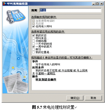 用戶(hù)可以設(shè)置一個(gè)或多個(gè)來(lái)電處理規(guī)則,來(lái)電處理規(guī)則能夠協(xié)助用戶(hù)處理來(lái)電,讓客戶(hù)得到最好的電話(huà)支持或服務(wù)。我們可以這么使用此功能,如:外出時(shí)將所有來(lái)電轉(zhuǎn)至語(yǔ)音信箱,節(jié)假日時(shí)將電話(huà)轉(zhuǎn)至手機(jī)等。