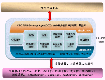 Hi-Link核心控制層包括以下幾個部分:ACD、IVR、呼叫統(tǒng)計分析、呼叫監(jiān)控管理、坐席質(zhì)量管理、系統(tǒng)配置管理、預(yù)測外撥管理、業(yè)務(wù)分析平臺、雙機(jī)熱備機(jī)制、分布互連機(jī)制、工作流平臺。