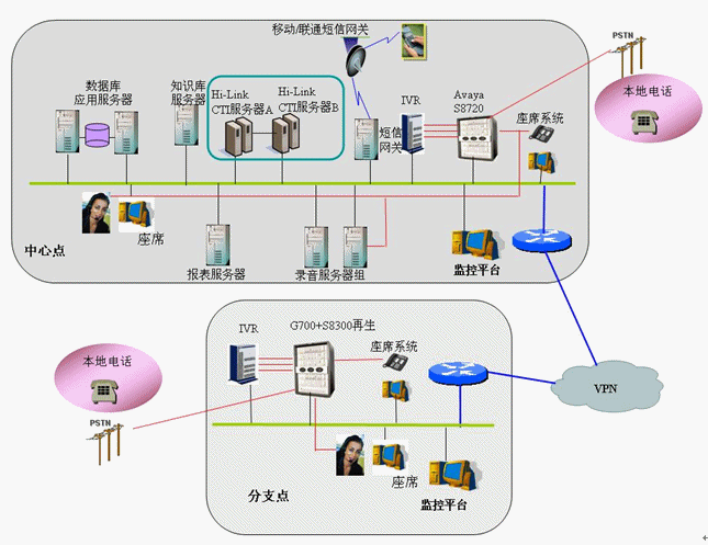 整個(gè)網(wǎng)路可以劃分為Internet接入部分、電話接入部分、CTI系統(tǒng)內(nèi)網(wǎng)、辦公網(wǎng)絡(luò)和座席系統(tǒng)5個(gè)部分。Internet接入部分實(shí)現(xiàn)網(wǎng)絡(luò)訪問(wèn)的受理和轉(zhuǎn)發(fā);電話接入部分完成電話語(yǔ)音和傳真的接續(xù)和處理;CTI系統(tǒng)內(nèi)網(wǎng)完成電話呼叫的控制和應(yīng)用的集成;座席系統(tǒng)部分完成語(yǔ)音和控制信息的接收和處理,為座席提供通話能力和業(yè)務(wù)處理能力。