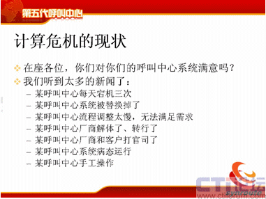 呼叫中心現(xiàn)在已經了比較嚴重的計算危機,我聽到了很多,因為我重點是在搞技術這一行當,我就問一個問題,在座的各位,你們對你們的呼叫系統(tǒng)滿意嗎?我相信大部分人可能嘴上都說比較滿意,但是很多人對深層次的矛盾都非常清楚,為什么不滿意?
