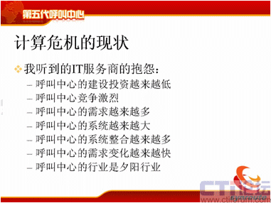 我們聽到IT服務商的抱怨可就更多了,說呼叫中心建設投資越來越低了,我在十年前建設一個20個座席的呼叫中心,能掙1500萬;可是現(xiàn)在20個座席的呼叫中心,10萬塊錢就把我打發(fā)了。呼叫中心競爭越來越激烈,投一個標,雖然一個呼叫中心只有100萬,這時候來的廠家有50家,相互壓價,相互壓價,這時候利潤都沒有了,F(xiàn)在的需求是越來越多了,體現(xiàn)在各個環(huán)節(jié),運營管理和業(yè)務模式上需求越來越多,最終客戶的要求也是越來越多,系統(tǒng)越來越大了,服務器也一大堆,以前一兩個服務器就夠了,現(xiàn)在需要4、5個,7、8個,這些服務器還需要相互進行聯(lián)絡整合,系統(tǒng)的整合越來越多,比如要和ERP整合,要和CRM整合,要和供應鏈整合,系統(tǒng)的整合越來越多,而且需求變化越來越大,呼叫中心需求的變化產生于很多方面,后面我會仔細介紹。呼叫中心的行業(yè)變成一個夕陽行業(yè)了,這是現(xiàn)在做IT服務商普遍在提的想法。