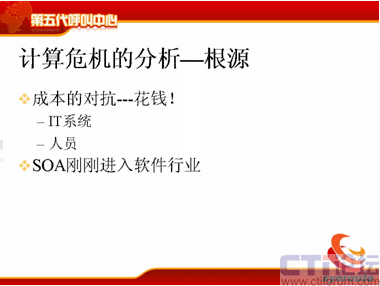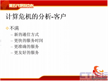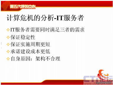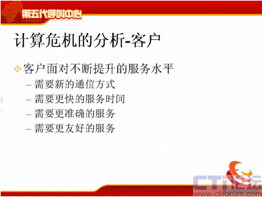 我分析一下計算的危機,計算危機來源于三個方面,第一是客戶面對不斷提升的服務水平,現(xiàn)在需要新的通信方式,包括電話、傳真、短信、電子郵件等等,還包括網上的護航瀏覽,表單共享,電子排版等等通信方式。第二方面需要更快的服務時間,80%的電話是20秒接起,可是短信的響應時間為什么這么長,需要更準確的服務,電話的服務是什么樣的,我現(xiàn)在需要網上交談的服務質量也能夠得到保障等等,這是客戶對IT服務者提供的壓力。