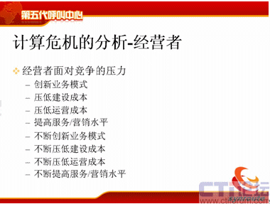 那么經營者的壓力就更大了,首先我要創(chuàng)新業(yè)務模式,我以前是做客戶服務的,現(xiàn)在我要掙錢,我要增加收入,我要做電話營銷,壓低建設成本,壓低運營成本,這個是大家很容易理解的。同時他是不斷地創(chuàng)新業(yè)務模式,不斷地壓低建設成本,不斷地壓低運營成本,不斷地提高服務水平,這個不斷就給IT服務者傳遞了更大壓力。