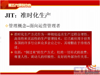 這四個特性是相輔相成的,首先在獨立方面,每一部分都有自己的特點,適應自己企業(yè)發(fā)展的需要,同時也是相互制約的。首先我說這個獨立意識,對于呼叫中心來說,從經營者的角度上,為什么要提TSP的概念呢?我們經常遇到一個企業(yè)建立呼叫中心,是一個客戶服務中心,我們現(xiàn)在要做電話營銷了,那好吧,我們就建一套電話營銷系統(tǒng);這時候我們要做網絡方面的營銷,好了,我們再做一個網絡營銷的呼叫中心,這是經營者現(xiàn)在意識亟待需要提高的。對于運營管理者來說,JIT思想,我剛才說過它是一個核心的,它是一個不斷需要改進流程的,改進去優(yōu)化的,提出各種KPI指標去優(yōu)化的,那么這個過程也是現(xiàn)在目前運營管理者一直比較薄弱的,需要一直提高的部分。