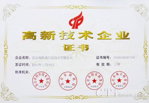CTI論壇(ctiforum)3月23日消息(記者 浩宇):商路通再傳喜訊,2012年3月12日商路通獲得了“國家級高新技術(shù)企業(yè)”證書,(證書編號:GR201111001184,有效期三年),這標志著商路通發(fā)展的又一個新的里程碑。