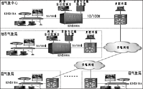 每個縣氣象局各部署一臺KDV8010A高清晰視頻會議終端,通過以太網(wǎng)接入到上級地市氣象局的KDV8000A多點控制單元。