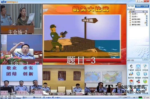 本次架設(shè)的空軍大比武平臺,滿足了總部主持指揮協(xié)調(diào)和各二級部參加比賽的應(yīng)用?偛颗c各二級部分別架設(shè)網(wǎng)動視頻會議硬件終端,分會場觀眾通過登錄網(wǎng)動統(tǒng)一通信平臺Active UC®觀看實時比賽畫面,并與現(xiàn)場互動、點評。總部主持人可共享參賽部門的答題桌面,把答題結(jié)果展現(xiàn)給評委和各會場觀眾。系統(tǒng)可實現(xiàn)舉手搶答,答題結(jié)果實時上傳等貼心功能。