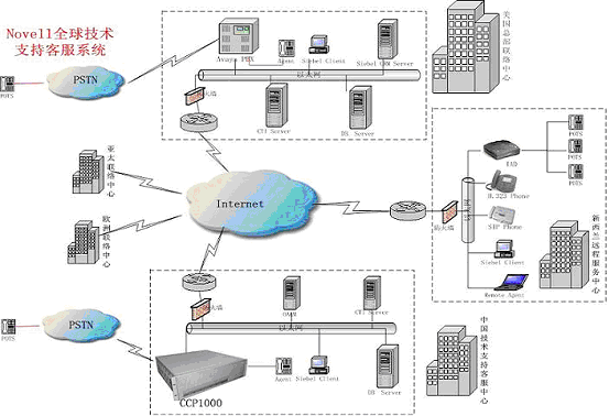 Novell中國(guó)技術(shù)支持中心采用融天科技的RT-CCP1000作為呼叫處理平臺(tái),業(yè)務(wù)處理通過Internet用瀏覽器的方式使用美國(guó)現(xiàn)有的Siebel CRM業(yè)務(wù)系統(tǒng),作為Novell全球客戶服務(wù)支撐體系的一個(gè)分支,響應(yīng)來自全球的客戶服務(wù);贗P網(wǎng)絡(luò),系統(tǒng)設(shè)立了遠(yuǎn)端座席,為不同地區(qū)的用戶提供本地化、無差異化的服務(wù)。