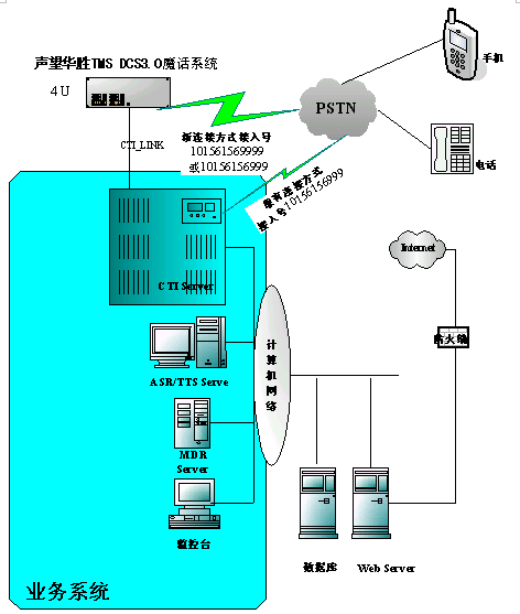 現(xiàn)有用戶(hù)只需在現(xiàn)有的任何聲訊臺(tái)上安裝聲望華勝TMS DCS3.0魔話(huà)系統(tǒng)即可,例如原有系統(tǒng)4E1接入,方法是直接將原有4E1中繼線(xiàn)路接入魔話(huà)系統(tǒng)設(shè)備,再?gòu)哪г?huà)系統(tǒng)設(shè)備上引出4E1中繼接入到原有系統(tǒng)設(shè)備。(當(dāng)然用戶(hù)如果原來(lái)使用的是聲望華勝TMS的語(yǔ)音卡或者想再二次開(kāi)發(fā),那么就可直接將魔話(huà)系統(tǒng)集成到現(xiàn)有的一個(gè)系統(tǒng)當(dāng)中,提供二次開(kāi)發(fā)API接口),就可在原有流程上實(shí)現(xiàn)奇妙的魔話(huà)和變聲業(yè)務(wù)。