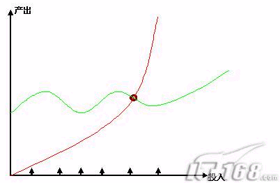 我們可以看到,投入和產(chǎn)出是按月增長(zhǎng)的,那么億美目前呢,是(綠線)慢慢增長(zhǎng)的一個(gè)曲線,隨著投入增加,持續(xù)是一個(gè)規(guī)模性的增長(zhǎng)。這類似一個(gè)2003-2005年,持續(xù)是這樣一個(gè)營(yíng)銷型的穩(wěn)步增長(zhǎng)。那么,從2006年開始,這個(gè)地方(棕色)的出現(xiàn),開始出現(xiàn)新的變化和新的增長(zhǎng)方式,那么我們說(shuō)這個(gè)點(diǎn)叫做拐點(diǎn)。那么傾斜角度和產(chǎn)出就發(fā)生了變化了。那么比如今后發(fā)展到一個(gè)階段,新的平臺(tái),新的內(nèi)容出來(lái)后,那么這個(gè)拐點(diǎn)也同樣會(huì)發(fā)生變化。