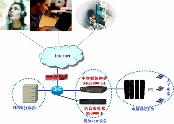 如圖,新加SIP融合通信平臺SS3000-E,完成客戶端軟電話的注冊、呼叫控制等功能;部署中繼媒體網關連接數(shù)據(jù)網絡和電話銀行系統(tǒng)的程控交換機。