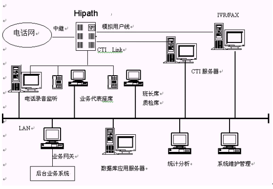 主要包括:Siemens Hipath 3000系列交換機(jī)、CTI服務(wù)器、IVR/FAX服務(wù)器、業(yè)務(wù)代表座席、班長和質(zhì)檢座席、電話錄音監(jiān)聽系統(tǒng)、數(shù)據(jù)庫應(yīng)用服務(wù)器、業(yè)務(wù)網(wǎng)關(guān)、統(tǒng)計(jì)分析工作站、系統(tǒng)維護(hù)管理工作站、網(wǎng)絡(luò)系統(tǒng),其邏輯結(jié)構(gòu)下圖所示。