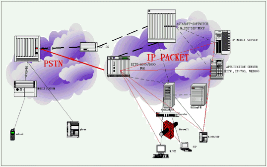 1、可以把裝有eProxy的服務(wù)器看成專(zhuān)用交換機(jī)VoIP switch,它負(fù)責(zé)內(nèi)外電話的接通與斷開(kāi)。如圖:
