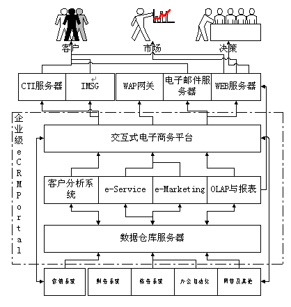 交互式電子商務(wù)平臺:負(fù)責(zé)將企業(yè)內(nèi)部的系統(tǒng)和企業(yè)的電子渠道(如:WEB、電子郵件、WAP、手機(jī)短消息和呼叫中心(Call Center)等)與企業(yè)內(nèi)部的業(yè)務(wù)系統(tǒng)(如:銷售系統(tǒng)、ERP系統(tǒng))等連接起來共同為客戶提供更為有效的服務(wù)。