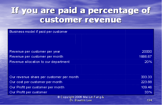 根據(jù)圖表12,我們可以算出第二種方式的利潤(rùn)百分比。如果我們假設(shè)每個(gè)客戶每年的收入是20,000美元,其中分配給呼叫中心部門的收入是20%。我們每個(gè)客戶每月的收入是333.33美元,每個(gè)客戶月的成本是223.88美元(參見(jiàn)圖表10)。這導(dǎo)致我們來(lái)自每個(gè)客戶每月的利潤(rùn)是109.46美元——這將產(chǎn)生33%的利潤(rùn)率。