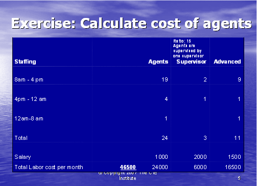 我們下一步就是計(jì)算出主管的成本。每次排班至少需要一個(gè)主管,如果這一排班的座席數(shù)要少一些,主管則也應(yīng)該能夠處理一些技術(shù)支持的電話。在這個(gè)例子中,我們將假設(shè)主管擁有高級(jí)支持座席的技術(shù)技巧。在圖表5中,你將看到我們使用了圖表4所得出的座席數(shù),并假設(shè)這是每次排班話務(wù)量中所需的各種類型員工的數(shù)量:基礎(chǔ),高級(jí)和主管。我們同時(shí)用圖表1中的薪資去計(jì)算座席和主管支持400個(gè)客戶的總成本。通過(guò)把每種座席單獨(dú)的成本相加(24個(gè)基礎(chǔ)座席,11個(gè)高級(jí)座席和3個(gè)主管),得出每月的人工成本為46,500美元。