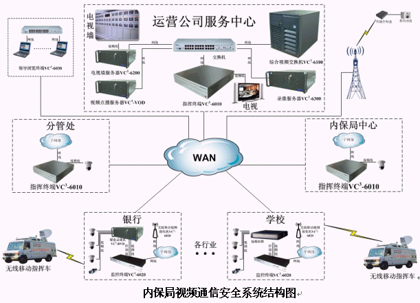針對(duì)以上情況,北京華緯訊電信技術(shù)有限公司基于最新推出的VC3-6000綜合視頻通信平臺(tái)提出了針對(duì)性的"城市安保聯(lián)動(dòng)視頻通信平臺(tái)"解決方案。該平臺(tái)整合多種資源,實(shí)現(xiàn)了視頻指揮調(diào)度、遠(yuǎn)程視頻監(jiān)控、視頻會(huì)議、視頻點(diǎn)播、無(wú)線移動(dòng)視頻接入、高清晰圖片傳輸和環(huán)境監(jiān)測(cè)等功能。平臺(tái)組成如下圖: