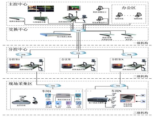 圖 4是一個典型的電力企業(yè)綜合視頻指揮調(diào)度系統(tǒng)網(wǎng)絡(luò)拓?fù)鋱D,在地理上可分一級機(jī)構(gòu)(主控中心操作顯示區(qū)、信息控制交換處理區(qū))、二級機(jī)構(gòu)(分控中心操作區(qū))、三級機(jī)構(gòu)(現(xiàn)場音視頻、數(shù)據(jù)、智能監(jiān)控點采集區(qū))。