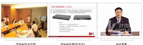 在主會場,分會場的會議室配備H3C高清視訊終端MG6060。H3C MG6060終端支持H.263、H.264等視頻編解碼協(xié)議,并采用了專有的視頻前、后處理技術(shù),使得圖像質(zhì)量大大提升,在周圍環(huán)境光照較差或者會場顏色搭配不甚和諧的情況下,仍舊能夠得到清晰、自然的圖像。視頻功能主要特色功能包括動態(tài)4CIF高清圖像、H.239雙視頻流傳送、畫中畫(PIP)、雙屏顯示、分屏顯示、VGA輸入、VGA輸出、桌面?zhèn)魉、圖像屏蔽、圖像參數(shù)調(diào)整等。有關(guān)H3C
