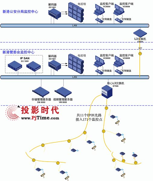 除了攝像頭與圖像顯示設(shè)備之外,整個監(jiān)控系統(tǒng)主要采用的都是H3C設(shè)備。系統(tǒng)用11(應(yīng)改成10條,最終只用了10條)條EPON光路接入全部171個監(jiān)控攝像頭;并采用專業(yè)的EX1000存儲產(chǎn)品為120T關(guān)鍵歷史視頻數(shù)據(jù)的提供了高可靠性的存儲保護(hù);而S7506、S3600交換機(jī)優(yōu)化的組播特性和特色的雙流技術(shù)則確保了所有監(jiān)控點的高清晰、高實時性、支持大量并發(fā)訪問。系統(tǒng)的集中管理、批量配置、全網(wǎng)網(wǎng)管也可以為新港開發(fā)區(qū)節(jié)省管理成本。
