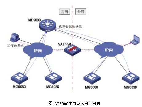ME5000 提供4個以太網(wǎng)口,其中3個網(wǎng)口可以用來召開視訊會議,這3個網(wǎng)口可以跨越在不同的網(wǎng)段上,實(shí)現(xiàn)公、私網(wǎng)的穿越,同時也可以為用戶提供網(wǎng)絡(luò)負(fù)載均衡的功能。在存在防火墻的環(huán)境中,可以把ME5000的兩個網(wǎng)口分別布置在防火墻的兩側(cè),連接內(nèi)、外網(wǎng)的視訊終端,從而可以直接繞過防火墻進(jìn)行開會,而不影響其它數(shù)據(jù)業(yè)務(wù)的安全,內(nèi)、外網(wǎng)進(jìn)出數(shù)據(jù)業(yè)務(wù)時仍然會通過防火墻,網(wǎng)絡(luò)安全保護(hù)作用不受影響。