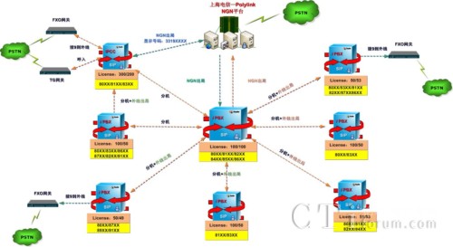 2.使用Polylink提供的VoIP語音服務(wù),用戶撥打021-3319XXXX號碼時(shí),電話直接經(jīng)過Polylink提供的電信VOIP線路,經(jīng)過IP傳送將電話送至IPBX系統(tǒng),再經(jīng)過IPBX系統(tǒng)根據(jù)相應(yīng)號碼選擇相應(yīng)公司進(jìn)行呼叫。