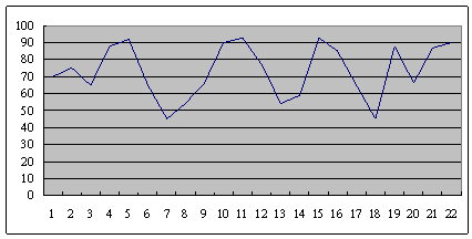這是另外一個呼叫中心的服務(wù)水平,也是從早上8點開始,一直到晚上6點,每隔半個小時的服務(wù)水平趨勢。雖然平均服務(wù)水平也是在73左右,但震蕩幅度卻小了很多,服務(wù)水平只在81到68這中間震蕩。