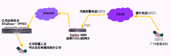 - 跨地域來(lái)電轉(zhuǎn)接,比如某個(gè)分支機(jī)構(gòu)的客戶(hù)撥叫該分支機(jī)構(gòu)電話,電話接起后,如果客戶(hù)需求沒(méi)有得到順利的答復(fù),在客戶(hù)電話保持的情況下,可以將電話轉(zhuǎn)接到在全國(guó)的任何一個(gè)IPPBX分機(jī)上。